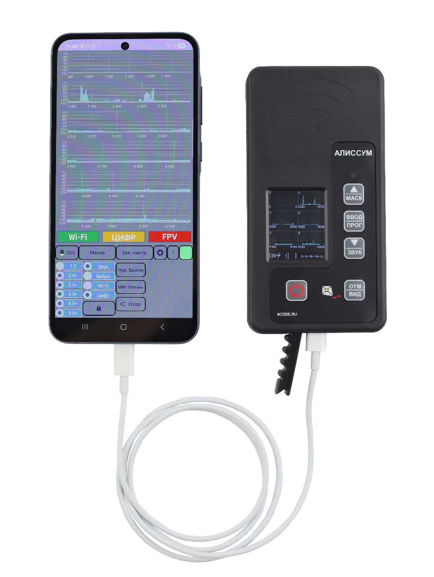 The Alissum-8 UAV detector allows you to detect a digital or analog video broadcast radio signal from UAVs in the range from 300-8000 MHz at ranges of at least 1 km in line of sight.